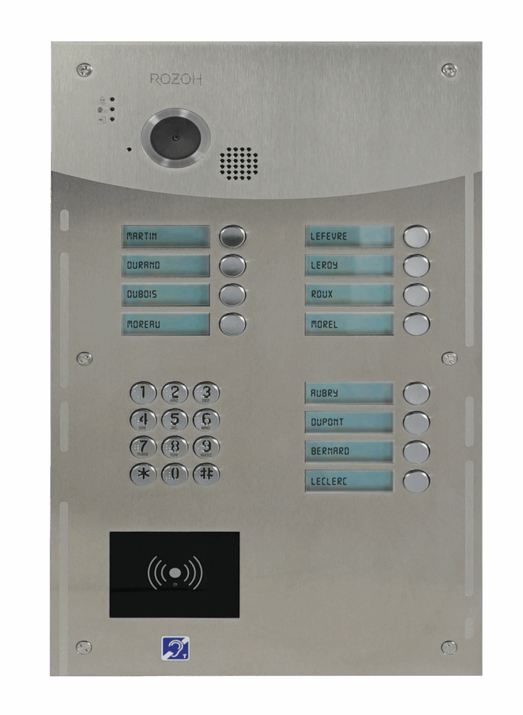 L’interphone vidéo à boutons à affichage digital des noms en finition Inox s’adapte de 4 à 20 boutons, selon vos besoins. Il se pose en encastrement. Il possède un clavier codé 12 touches et un lecteur de badges mains-libres, permettant une ouverture à distance.